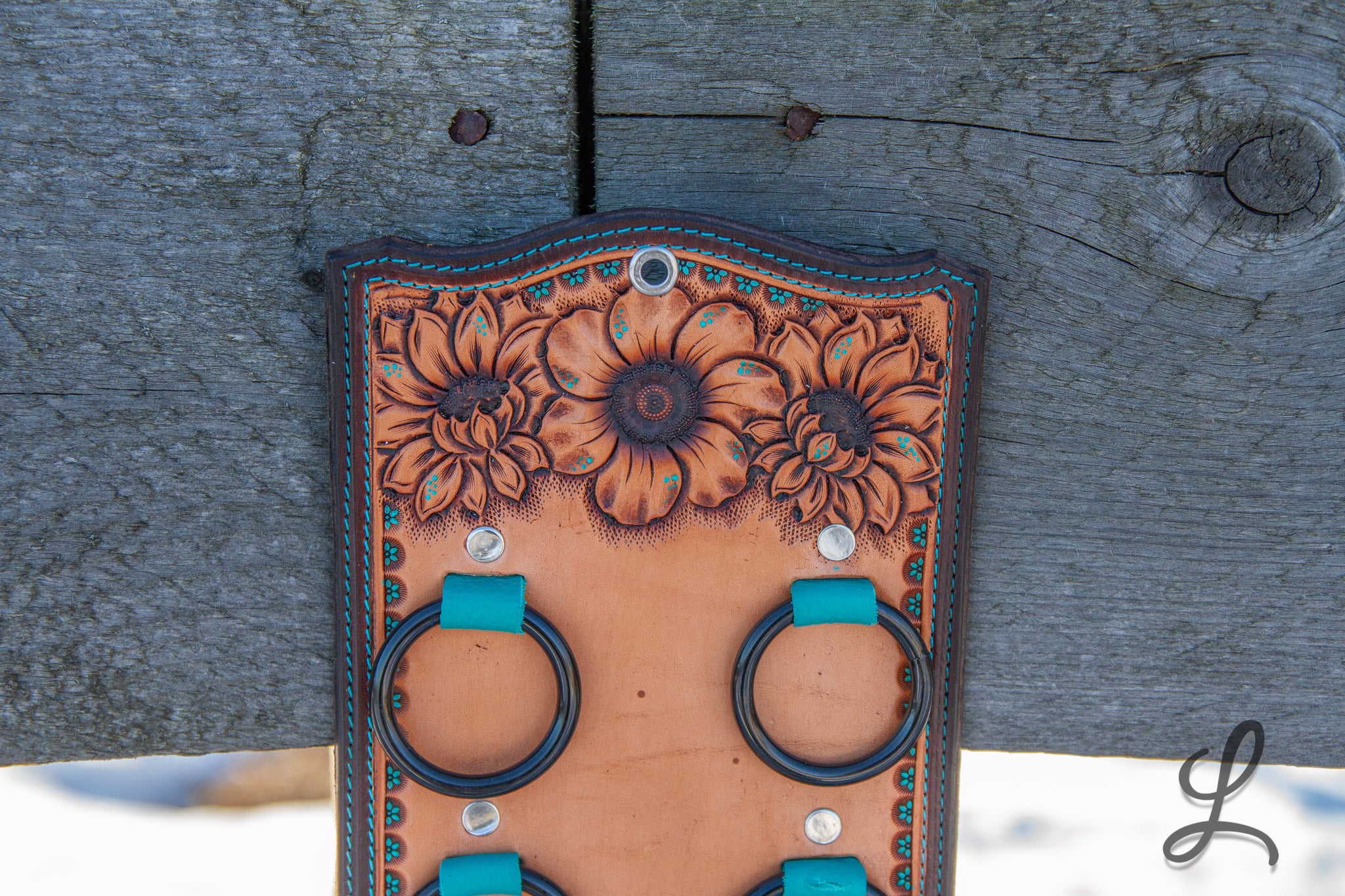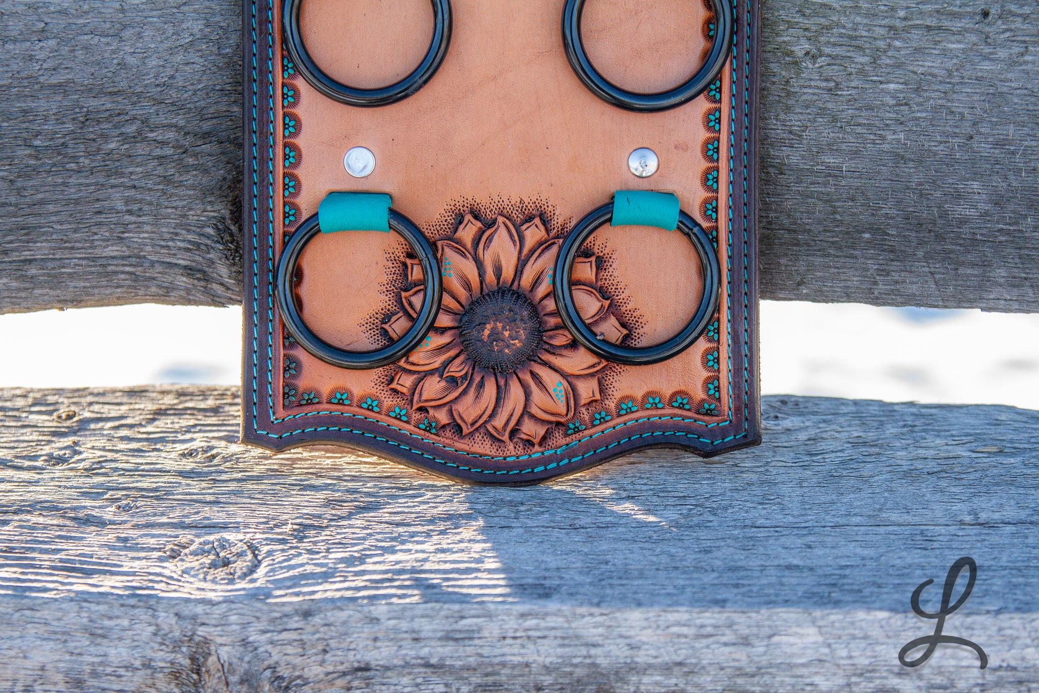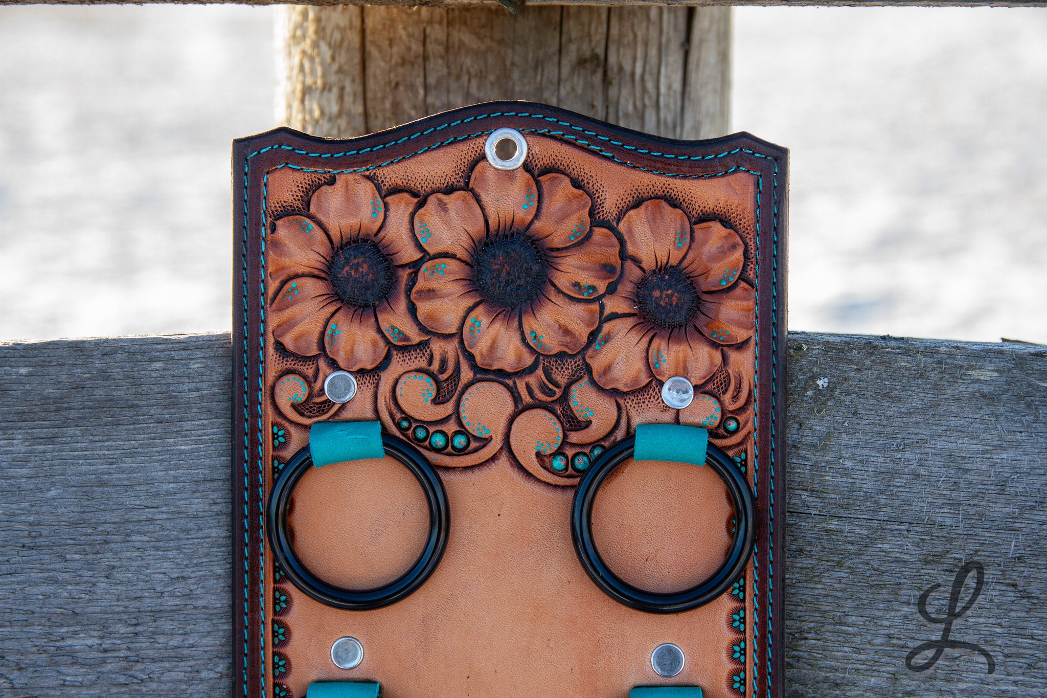 Elevate your western style with these stunning Wild Rag Holders, crafted from gorgeous Hermann Oak leather and fully lined for durability. Each piece features eye-catching turquoise accents, delicate turquoise dots, and vibrant sunflower details that bring personality to your gear. The turquoise thread stitching and sleek black hardware complete the look, creating a perfect blend of rugged functionality and artistic flair.