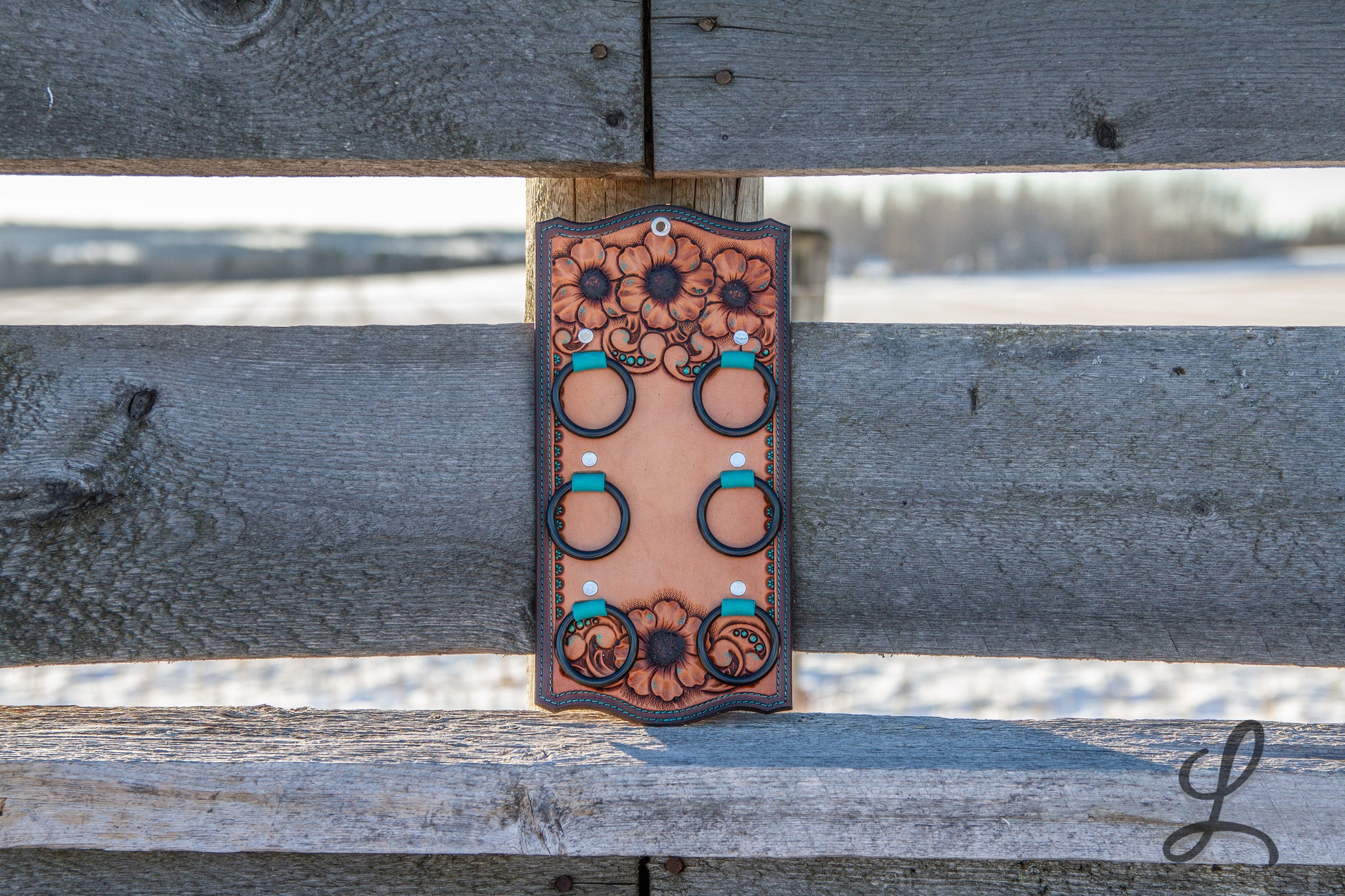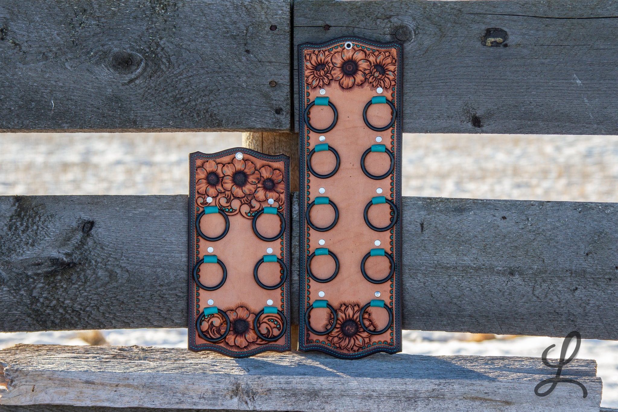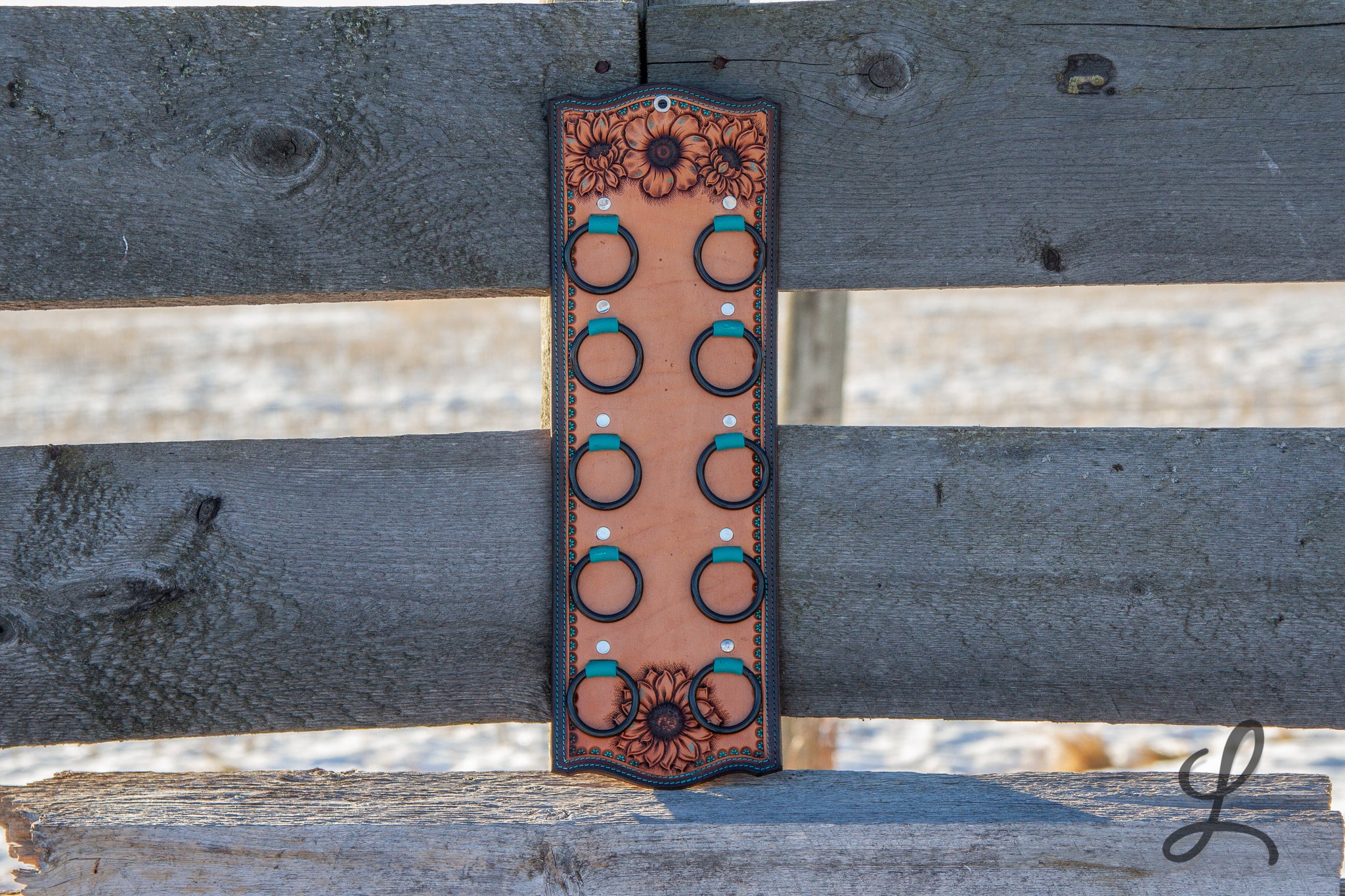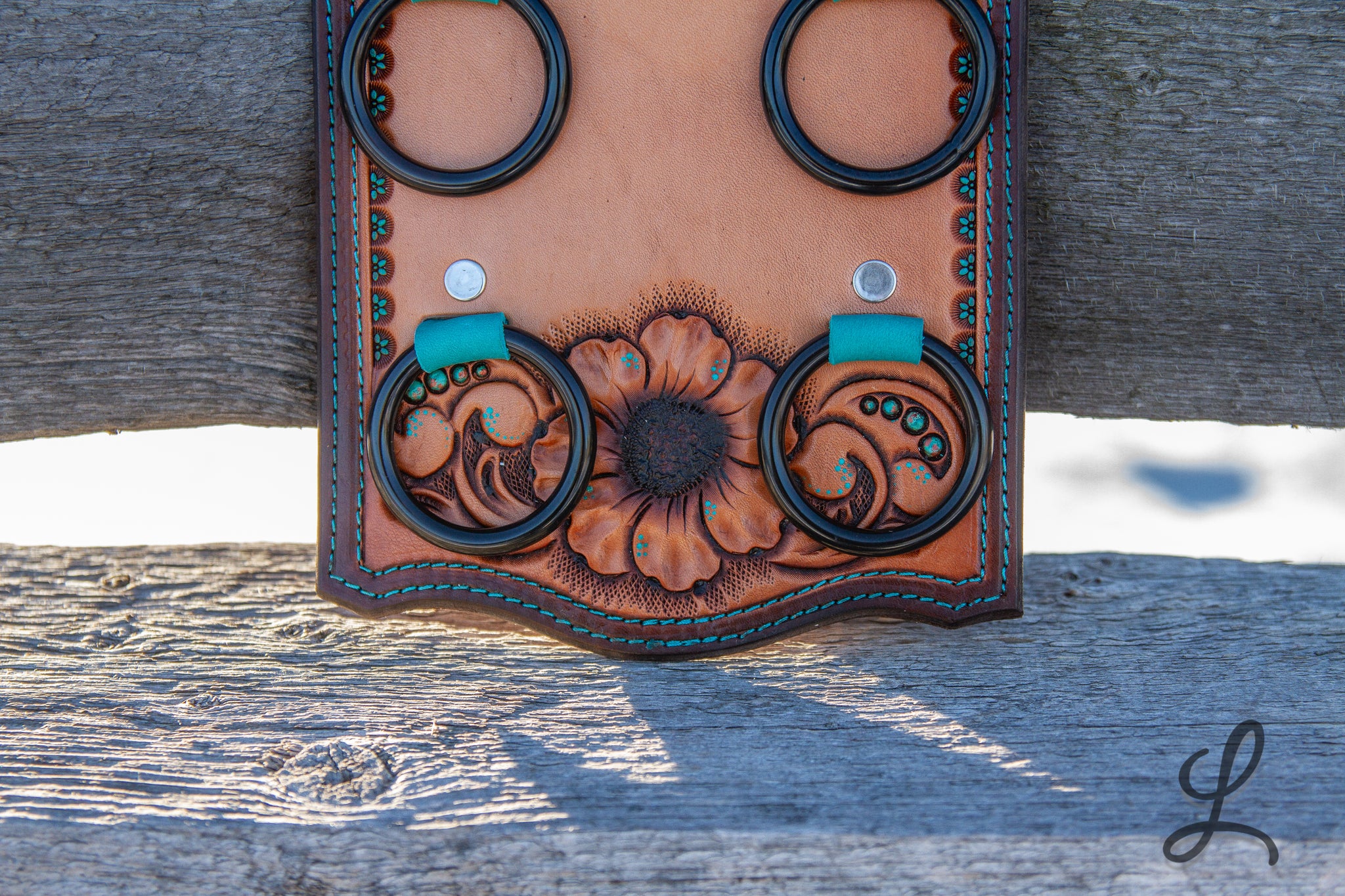 Elevate your western style with these stunning Wild Rag Holders, crafted from gorgeous Hermann Oak leather and fully lined for durability. Each piece features eye-catching turquoise accents, delicate turquoise dots, and vibrant sunflower details that bring personality to your gear. The turquoise thread stitching and sleek black hardware complete the look, creating a perfect blend of rugged functionality and artistic flair.